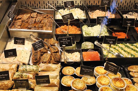 El producto local por excelencia es una versión del arenque que se prepara de muchas maneras y se pueden degustar en los carritos de la calle que también ofrecen productos de calidad. Destacamos un puesto de perritos de salchicha de alce y reno, situado en la esquina Hötorget frente al mercado del mismo nombre.