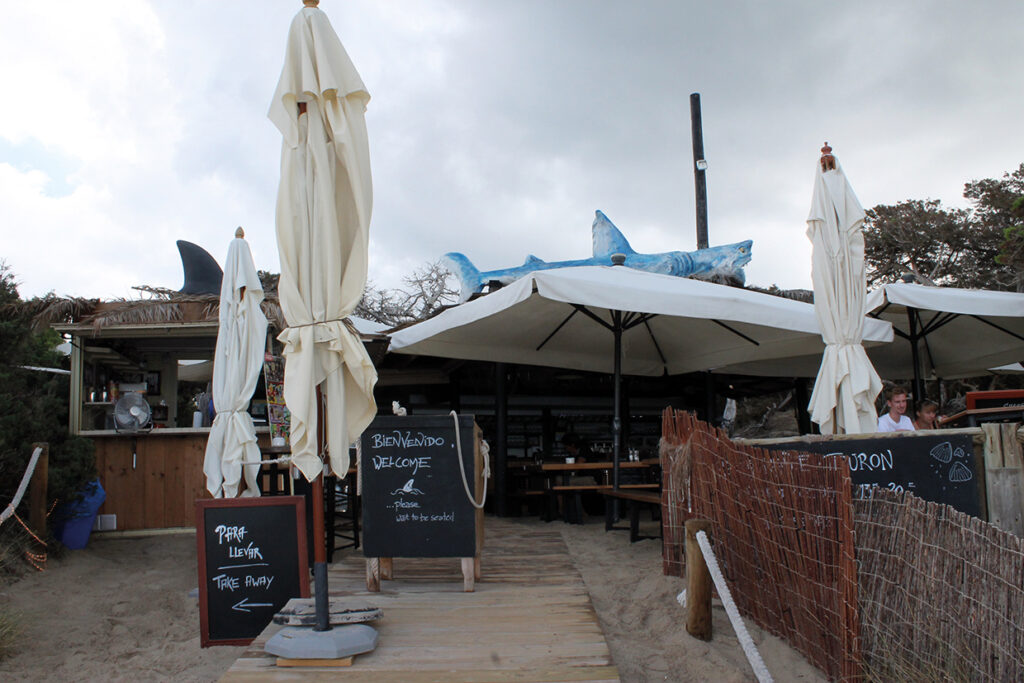 Según empezamos a caminar nos encontramos con el chiringuito “Sa Segui”, seguido de “El Tiburón”, y mas allá el magnífico restaurante “El Molí de Sal”.  Y ya casi al final de la manga el restaurante de Juan y Andrea en el que podemos disfrutar de un delicioso arroz entre fina arena y palmeras.
