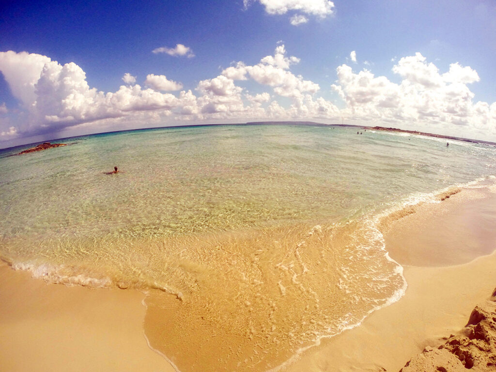 Hay que tener en cuenta que en época estival en La Savina no es fácil conseguir amarre y los amarres de paso no se permiten. Atracamos en la zona de levante donde para nuestra sorpresa comienza una de las playas más bonitas de la Isla, Ses Illetes.