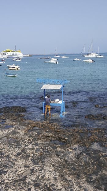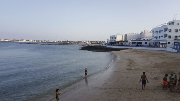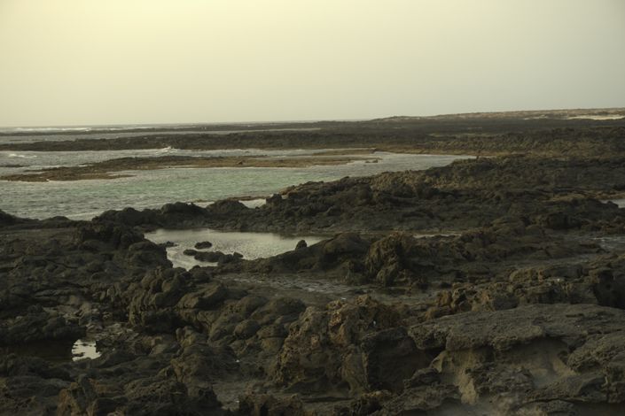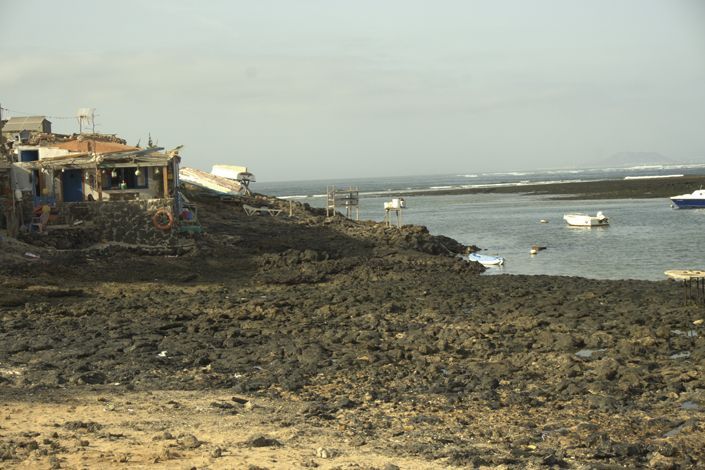 Un delicioso baño y un largo paseo por la orilla nos llevan de una playa a otra que tras las mareas cambian de silueta. Las rocas se llenan de caracolillos y otros animales que viven en los charcos que se forman. Hay poca gente ya que son kilométricas. Nudistas, familias y ambiente surfero conviven al borde del mar. Protectores del viento de piedra volcánica como de si casitas se tratara se intercalan en la playa. Al fondo, la Isla de Lobos a la que realizamos una excursión y que os contaremos más adelante. Después de disfrutar tanto del salvaje entorno y del mar nos dirigimos a tomar algo y a conocer el pueblo de Corralejo.