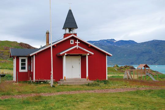 En Brattahlíð se construyó la que sería la primera iglesia del Nuevo Mundo en honor a la esposa de Erik, que impulsó su construcción tras su conversión al cristianismo. Se trataba en realidad de una pequeña capilla, de la cual se ha construido una réplica en la actualidad cerca de donde se emplazaba, junto con una langhus. El propio Erik nunca abandonó el paganismo, aunque según la leyenda se habría convertido al cristianismo en su lecho de muerte inducido por su esposa.