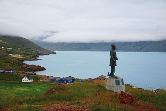 Abandonamos Qassiarsuk ascendiendo por tierras fértiles, verdes, repletas de ovejas generalmente en grupos de tres (madre e hijos) dejando el fiordo bajo nuestros pies con la imponente figura de Leif Eriksson “El Afortunado”, hijo del explorador vikingo Erik el Rojo, fundador del primer asentamiento vikingo en Groenlandia.