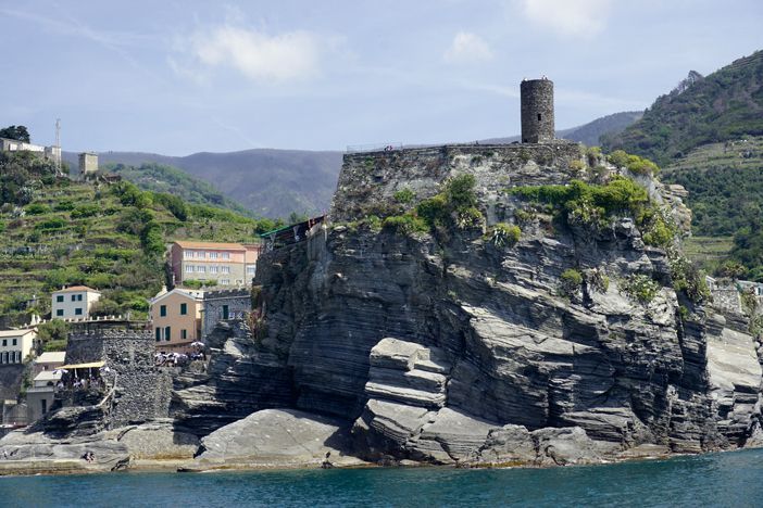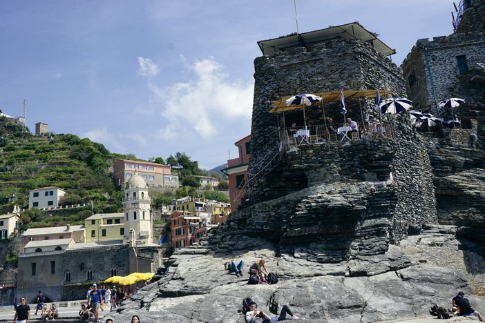 Coronado por la torre Belforte, Vernazza nos encantó, es uno de los pueblos más bellos y auténticos. Nos recibe una plaza abierta al mar con un muelle y una pequeña playita. En cuanto la arena acaba, la disposición de las rocas forma piscinas naturales de aguas de azul intenso y en las que se derrama un torrente de agua dulce en forma de cascada. Otra bella imagen para recordar.
