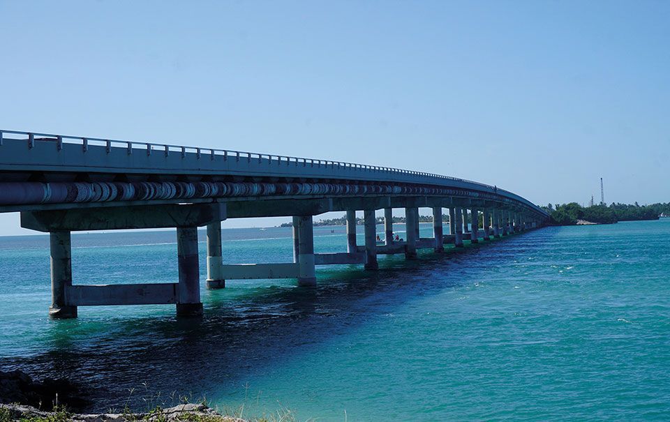 Y por fin alcanzamos al emblemático Puente de las Siete Millas. Una obra de ingeniería (1978-1982) que se construyó debido a que el antiguo Puente del Ferrocarril (1909-1912) sufrió graves daños durante el huracán del Día del Trabajo de 1935 y el huracán Donna en 1960. Actualmente podemos ver el obsoleto puente partido que discurre en paralelo al Seven Mile Bridge. El puente viejo está abierto y se puede pasear por él. En el mes de abril, el Seven Mile Bridge cierra durante unas horas para conmemorar su reconstrucción con un Maratón en el que participan 1500 corredores. Cuando se terminó en 1982, se erigió como el puente más largo del mundo. Hoy en día es uno de los más extensos de América y conecta la ciudad de Marathon con Little Duck Key en los Cayos Bajos. Como ya hemos comentado esta travesía resulta todo un espectáculo. Mientras lo cruzábamos, un pequeño islote apareció en un lateral, se trataba de Pigeon Key o Cayo Paloma, un distrito histórico por haber sido el punto de partida en la construcción del Ferrocarril de la Costa Este de Florida. Varios edificios de la época permanecen en la isla.