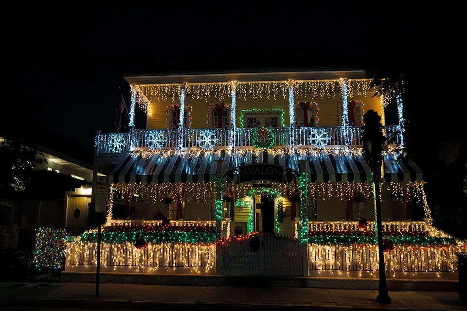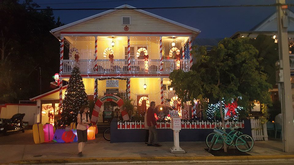 Al caer la noche, Cayo Hueso nos presenta otra cara mágica. En estas fechas de noviembre, las luces de navidad hacen su aparición por todas partes. Sabemos que forma parte de la tradición americana, pero nunca lo habíamos vivido tan de cerca. Puertas, barandillas, tejados, ventanas, jardines, árboles, carteles, tiendas, hoteles, parques, quioscos, absolutamente todo, se ilumina con destellantes bombillas de vivos colores. Atónitos pedaleamos parando a fotografiar cada inmueble, en el que no queda absolutamente ningún elemento sin alumbrar. Una sorprendente decoración navideña al más puro estilo americano. Una vez dejamos las bicicletas en la tienda de alquiler, insertando la llave de los candados en un buzón tal y como nos habían explicado, recorrimos Duval Street en plena juerga nocturna. Nos dirigimos al emblemático Sloppy Joe´s Bar, un establecimiento con mucha historia situado en la esquina de Duval Street con Green Street desde 1937. Se puede comer, beber y tomar elaborados cócteles. Realiza conciertos de música en vivo y tiene instaladas webcams para indagar desde cualquier lugar el ambiente del que goza en tiempo real. Fue muy frecuentado por E. Hemingway. En Sloppy Joe´s Bar la diversión está asegurada.