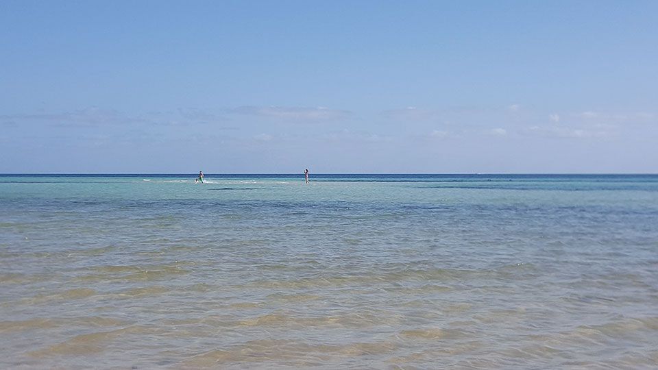 Después un día tan fructífero, nos retiramos al hotel a recuperar fuerzas, no sin antes programar, en la misma recepción, una excursión en catamarán para la mañana siguiente al arrecife de coral situado escasamente a una hora de la costa. Tras un nutritivo desayuno, nos esperaba un transfer con un grupo reducido de personas. Me encanta el mar y la experiencia fue realmente increíble. Disfrutamos tanto de la navegación en catamarán como del increíble fondo submarino del arrecife en un día de sol extraordinario. Durante la travesía avistamos una enorme tortuga por uno de los costados de la embarcación. Una vez tiraron el ancla, divisamos a cierta distancia un pequeño oleaje formando espuma contra algunos escollos que sobresalían del agua: era el arrecife. Nos dieron algunas normas y nos proporcionan el material que hemos de decir estaba en perfecto estado, unas gafas, aletas y un tubo de snorkel.