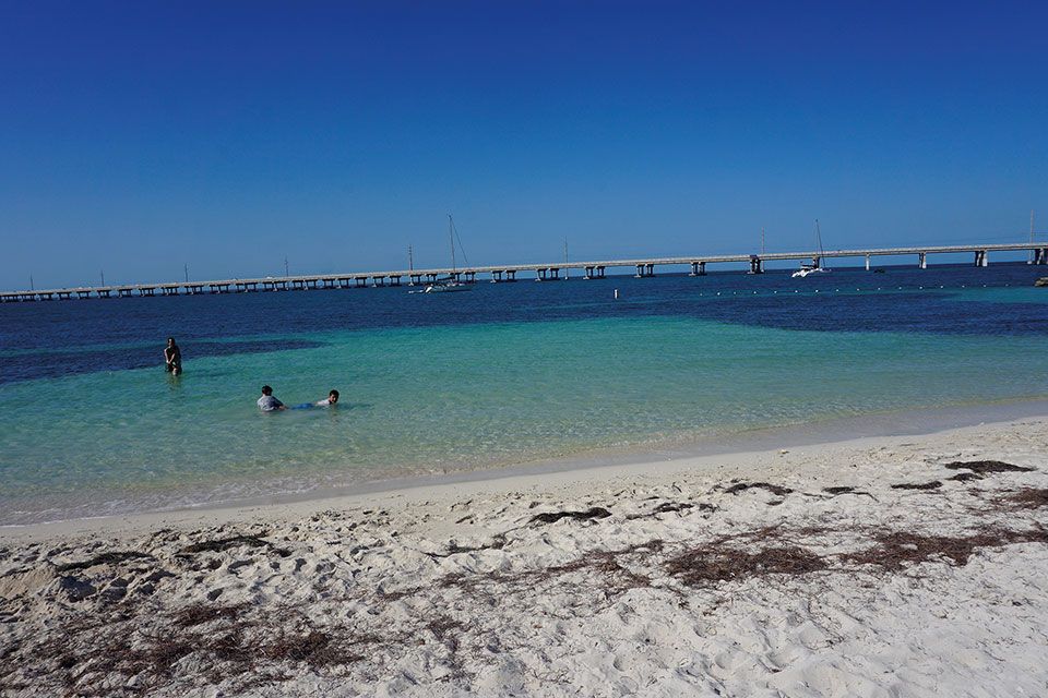 Justo al terminar el Puente de las Siete Millas encontramos otro valioso rincón, el Veterans Memorial Park, un lugar a tener en cuenta en el camino al Key West. Hay un cartel indicador con un pequeño aparcamiento donde una ensenada de algas de gran colorido y la fina arena crean pequeñas sendas que nos llevan a descubrir nuevas perspectivas.