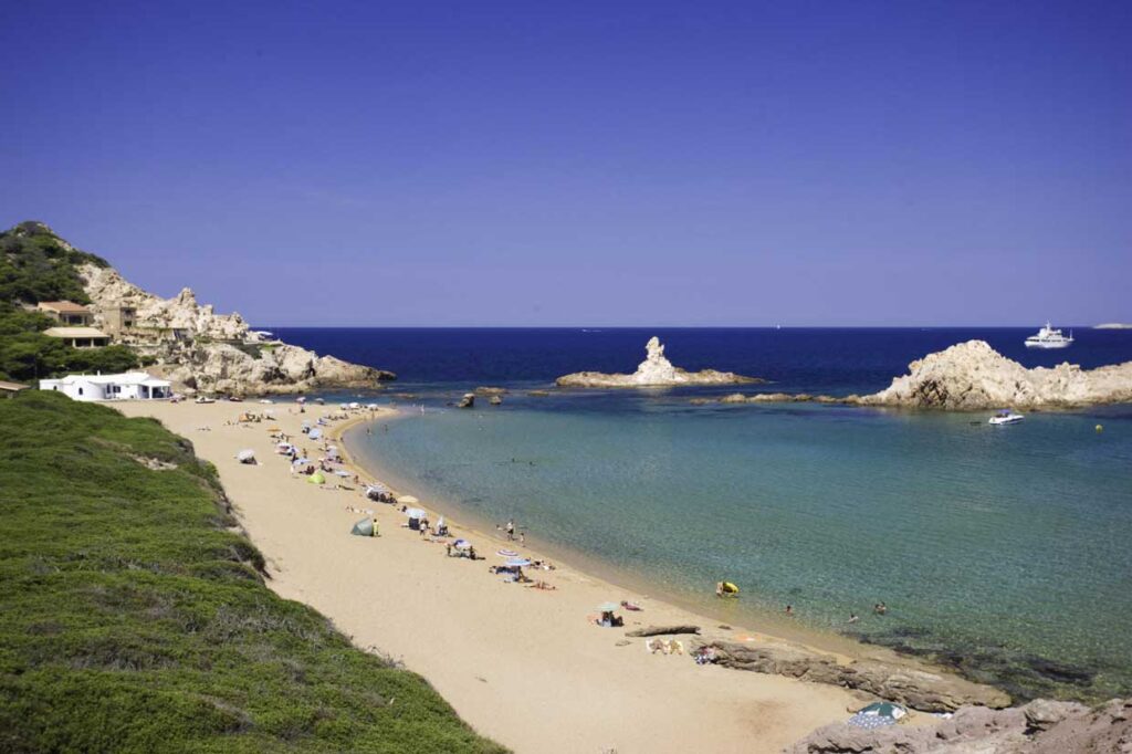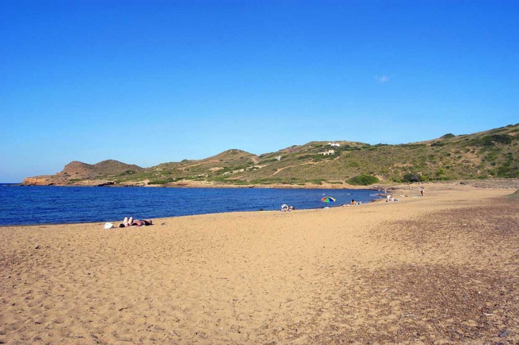 Desde aquí, la ruta sigue hacia el sureste, con playas más largas y abiertas como Binigaus, Santo Tomás y Son Bou, antes de encarar el regreso hacia Mahón.