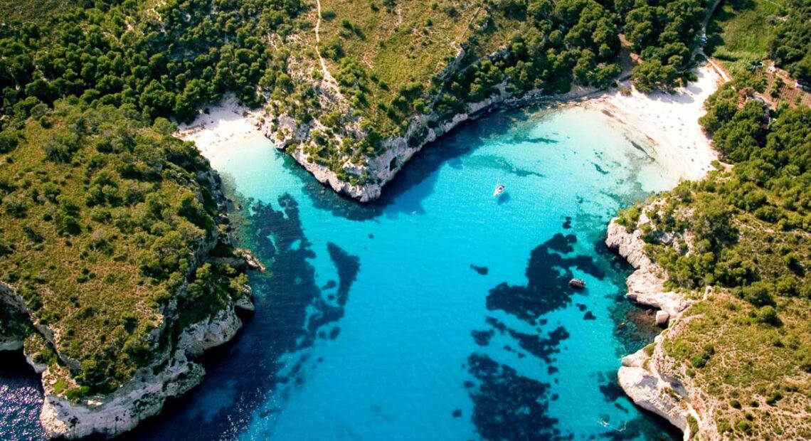 Al doblar el extremo suroeste de Menorca tras dejar Ciutadella atrás, la costa cambia radicalmente. Se deja atrás la piedra áspera del norte y se entra en un mundo de acantilados blancos, pinares frondosos y aguas de un azul increíble. Aquí están las calas más icónicas, las que suelen ilustrar postales, reportajes y sueños de verano.
