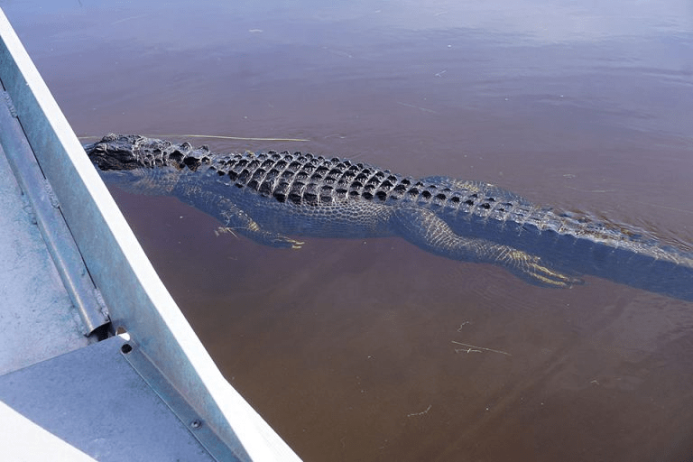 Avanzamos con desenfreno los humedales, agarrando gorras y gafas (ambas imprescindibles) sin lo que parecía un rumbo fijo, sobrevolando el follaje y adentrándonos en canales de agua más profunda en los que la maleza se alineaba a ambos lados para de repente volver a desaparecer un poco más allá. Llegamos una especie de laguna y se paró el motor. Empezamos a escudriñar las aguas, esta vez más oscuras y verdosas. Enseguida lo vimos. Un caimán se acercó muy decidido hacia nosotros, lo que nos impulsó a adentrarnos más en la embarcación. Llegó hasta los mismos bordes de la lancha y, aunque era de tamaño mediano, imponía lo suyo, y más cuando el guía nos comentó que los caimanes pueden saltar, lo que aumentó la tensión. Nos dio la impresión que buscaba que le echáramos comida, cosa que está completamente prohibido, pues nos indicaron que los caimanes no comen carne y de hacerlo,  les haría volverse carnívoros. Después de fotografiarlo, continuamos nuestra aventura divisando nuevos y extraordinarios parajes. Nos acercamos a las orillas y nos mantuvimos con los ojos bien abiertos, vimos distintas especies de aves, entre ellas, una que nos resultó bastante curiosa al tener el cuello muy largo y enrollado en un árbol que, en un principio, nos pareció parte de una serpiente. No nos quedamos con el nombre, y menos en inglés, pero era muy parecida a una garza real.