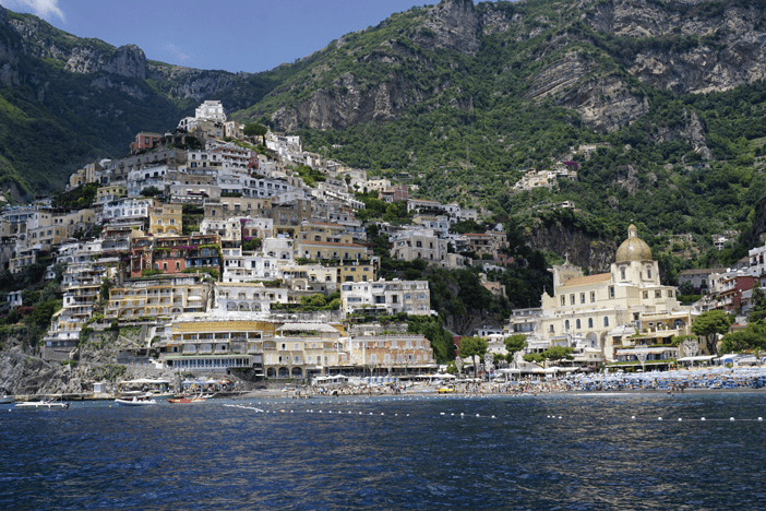 Positano es un pueblecito encantador situado al borde de un acantilado localizado en la costa Amalfitana. Enclavado en un escarpado, casitas de colores se agolpan en las empinadas laderas cara al mar. Posee una playita de agua azul intenso, siendo un llamativo destino vacacional. Callejuelas empinadas y estrechas de casas de estuco blanco y buganvillas llaman a perderse. Sobresale la iglesia Santa Maria Assunta con una cúpula de brillantes azulejos.
