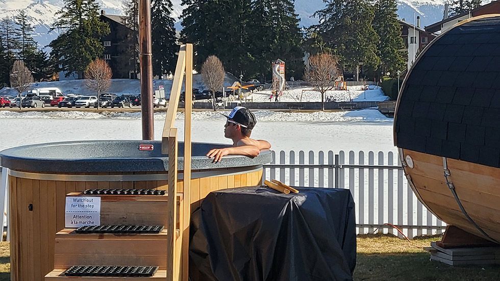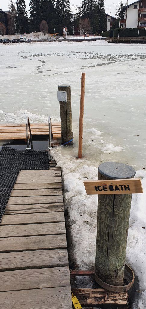 Crans alberga tiendas de lujo, galerías de arte y los mejores hoteles. Dar un paseo por Crans después de una jornada de esquí es una experiencia muy placentera. Recorriendo el idílico pueblecito de tradicionales chalets de madera tallada, no hay escaparate que se resista a una parada o a entrar en alguna de las atrayentes galerías de arte. Por las atractivas calles se instalan boutiques de exquisita decoración y relojerías de marcas muy distinguidas, así como sugestivos restaurantes. Finalmente encontramos el lago Etang Long completamente gélido, rodeado por un sendero que invita a recorrerlo. El entorno es espectacular, grandes cimas lo dominan resultando conmovedor a la maravillosa luz del atardecer. En uno de los tramos, unas escaleras descienden hasta el hielo que se halla recortado en círculo, indicando la zona habilitada para el baño. Al otro lado se encuentran las saunas y un jacuzzi al aire libre, en el que una persona disfruta del momento y el hermoso marco que lo rodea. Un contraste con la ropa de abrigo, gorro y guantes que vestimos, y que tan necesaria nos parece debido a las bajas temperaturas.