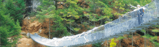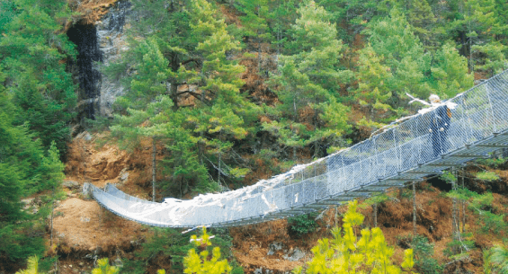 La temperatura va subiendo y la caminata pone en marcha los entumecidos cuerpos. Tras 350 metros de desnivel descendidos y cruzar otro río, aparece la segunda gran pendiente. El paisaje es majestuoso, los puentes tibetanos cada vez son más largos y más altos, pero bien anclados. Repletos de cientos de pañuelos de colores que ondean al viento y rezan a los Dioses.