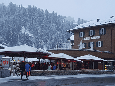 El ambiente del apreski, así como la vida nocturna en Lech, se desarrolla habitualmente en el interior de los lujosos hoteles que ofrecen todo tipo de servicios que el cliente necesita para disfrutar de tranquilidad, confort y relajación. Los bar-lounge reúnen hasta bien entrada la noche tanto a los huéspedes alojados como los que no. En las confortables terrazas de cara la montaña, se disfruta de la buena música mientras que bien entrada la tarde, observamos el descenso de esquiadores rezagados aprovechando el último minuto o, simplemente aquellos que regresan de hacer alguna ruta privada. Así ocurre en el bar-terraza del hotel Kröne, muy animado y situado en un lugar en el que casi tocamos los remontes.
