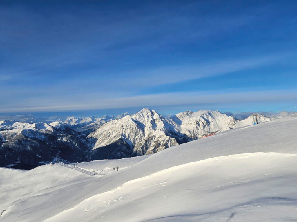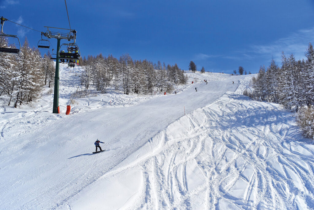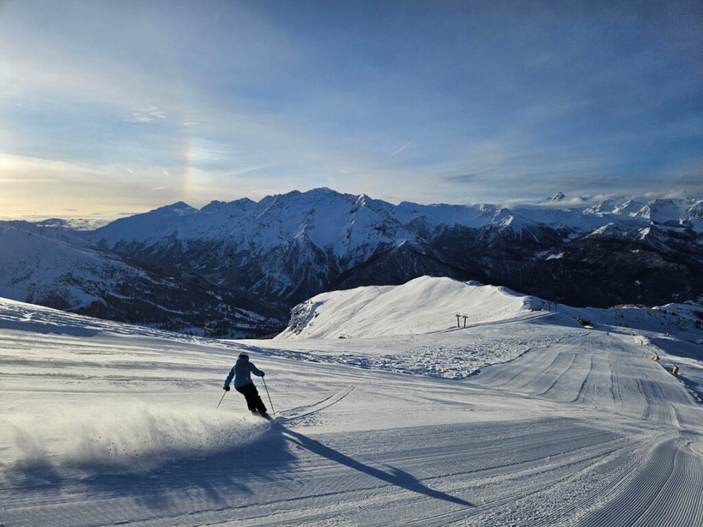 En Sansicario encontramos pistas para principiantes y un número significativo de pistas de dificultad intermedia, lo que la hace ideal tanto para esquiadores que están comenzando como para aquellos con un nivel intermedio. Disfrutamos mucho de sus amplias y largas bajadas.