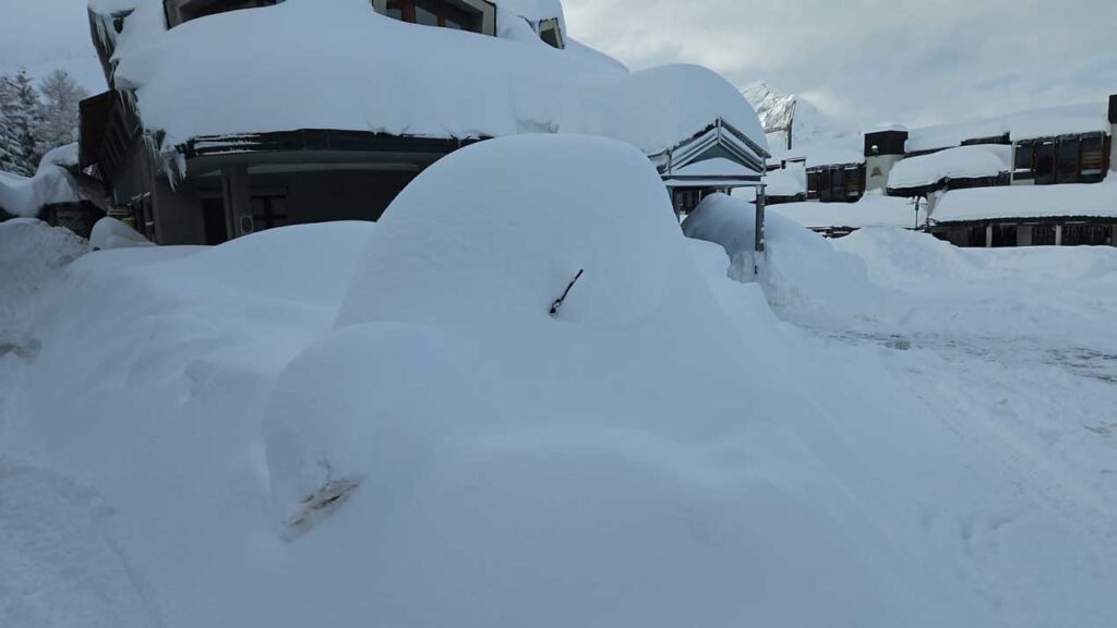 Esta gran nevada que duró toda la noche, dejó 2 metros de nieve y paralizó prácticamente los accesos en menos de una hora. Afortunadamente, el tiempo corrió de nuestra parte y aunque nos fue complicado encontrar el apartamento que habíamos alquilado, puesto que la nieve hizo inaccesible algunas calles de Sestriere, tuvimos que dejar el vehículo lo mas cerca posible y desplazarnos caminando entre lo que ya eran muchos centímetros acumulados.