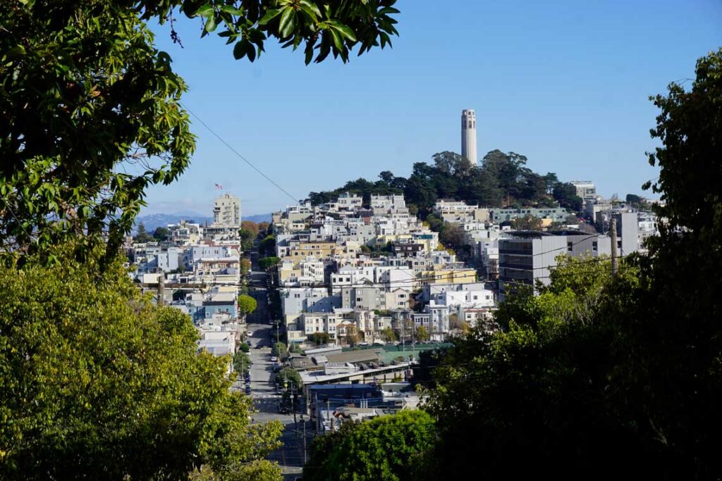 Subir la colina de Telegraph Hill entre arboles y vegetación en bicicleta eléctrica resultó bastante agradable, permitiendo vistas impresionantes en cada curva. En lo mas alto se halla la Coit Tower, uno de los monumentos más reconocidos de la ciudad. Esta torre de estilo art déco es famosa no solo por sus impresionantes vistas de 360 grados sino también por los murales que adornan su interior y que representan escenas de la vida cotidiana en California durante la Gran Depresión.