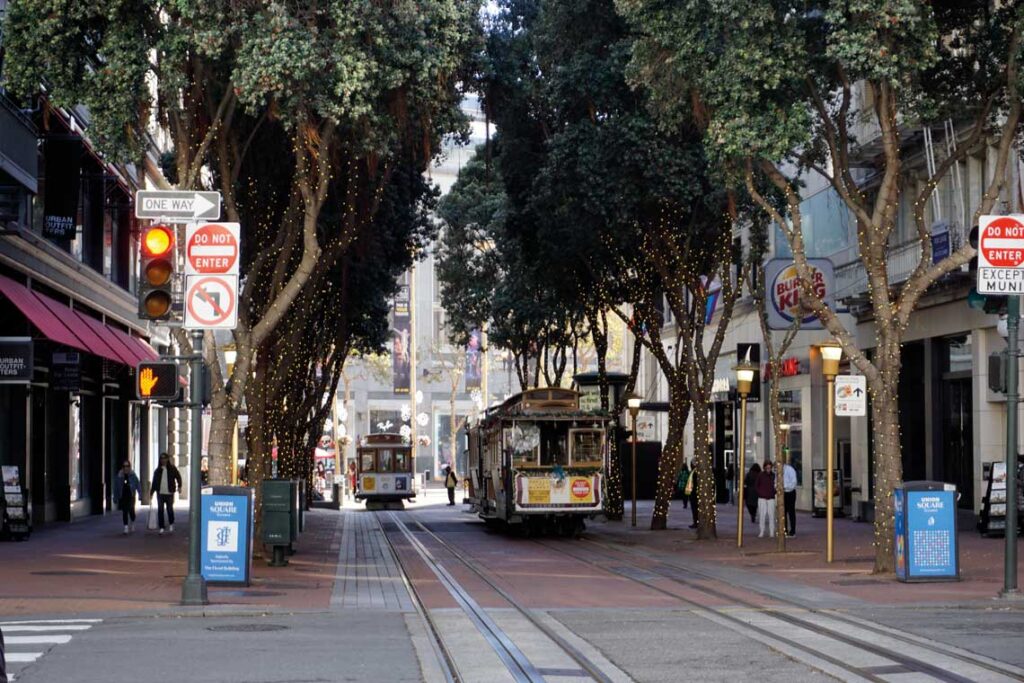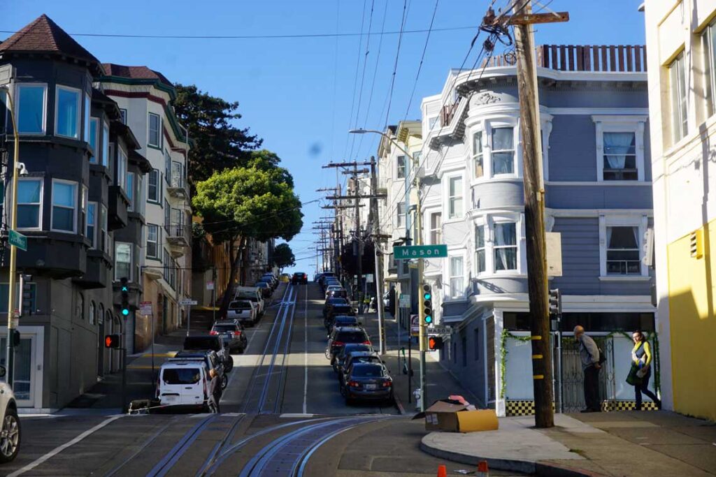 Nob Hill es uno de los barrios más exclusivos. Los tranvías, parte esencial de su historia, añaden encanto al área, especialmente las líneas Powell-Hyde y Powell-Mason, que cruzan el barrio y ofrecen una de las maneras más pintorescas de llegar a la cima, con vistas asombrosas durante el trayecto.