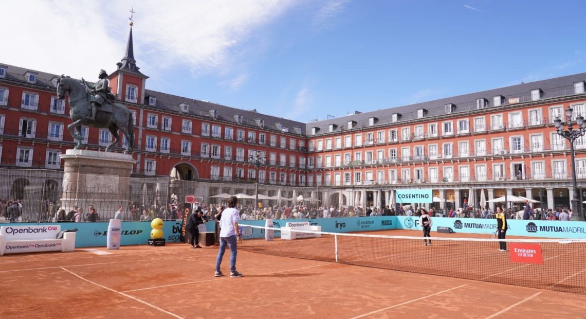 Desde hace unos días los madrileños pueden sentirse como verdaderos jugadores del Mutua Madrid Open de Tenis gracias a la nueva iniciativa del torneo. Y es que en la Plaza Mayor se ha instalado una pista de tenis de tierra batida que reproduce la del estadio Manolo Santana de la Caja Mágica en la que los tenistas profesionales disputan el torneo.
