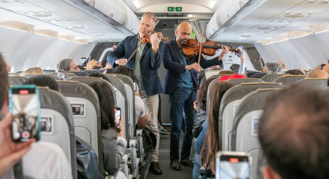 Durante el vuelo, dos integrantes del grupo, Cristiano Gualco (primer violín) y Simone Gramaglia (viola), sorprendieron a los viajeros con la emotiva interpretación de la aria «Quando le sere al placido«, de Giuseppe Verdi. En el cuarteto también destacan Paolo Andreoli (segundo violín) y Giovanni Scaglione (violonchelo), quienes han tocado junto a Gualco y Gramaglia por 25 años, conformando uno de los conjuntos de cámara más prestigiosos de la escena internacional.