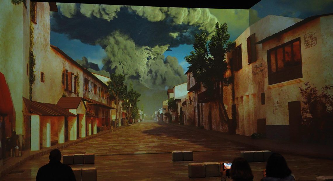 El recorrido continúa haciendo uso de las tecnologías digitales, al entrar en la gran sala inmersiva de 1.200 metros cuadrados de proyección en el que, con una minuciosa atención a los detalles (las lagartijas de todo el espectáculo son dignas de mención), muestran la vida cotidiana de los ciudadanos de Pompeya aquel fatídico día y cómo comenzó como un día cualquiera paseando por sus calles, para acabar sumergiéndose en las entrañas del volcán.